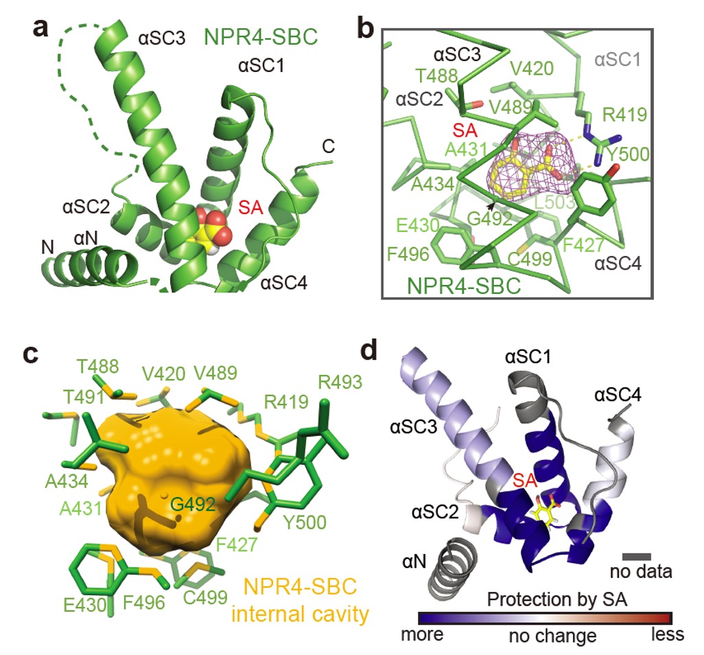 植物激素中的水楊酸 (salicylic acid, SA) 在植物抗病及獲得性免疫過程中起有樞紐作用。盡管在植物抗病反應(yīng)中的關(guān)鍵基因NPR1 (NONEXPRESSOR OF PATHOGENESIS-RELATED GENES 1)早在90年代末就被鑒定出來,NPR家族的另外兩個(gè)成員NPR3和NPR4也在2012年被發(fā)現(xiàn)是SA受體,但對(duì)于NPR蛋白是如何感知SA并協(xié)調(diào)SA信號(hào)轉(zhuǎn)導(dǎo)的分子機(jī)制仍不清楚。在該研究中,研究人員巧妙地利用了胰蛋白酶酶解和氫氘交換質(zhì)譜(HDX-MS) 的方法找到了擬南芥NPR4中直接結(jié)合SA的結(jié)構(gòu)域 (SA binding core, SBC),并通過變復(fù)性的方法,成功獲得了分辨率為2.3?的NPR4-SBC與SA復(fù)合物晶體結(jié)構(gòu),分析發(fā)現(xiàn)NPR1的SBC結(jié)構(gòu)域也能夠以類似方式結(jié)合SA,確認(rèn)了NPR1是SA的受體。該研究揭示了水楊酸與NPR受體結(jié)合的結(jié)構(gòu)基礎(chǔ)和分子機(jī)理;同時(shí),解決了NPR1作為SA受體的爭(zhēng)議。研究結(jié)果為進(jìn)一步了解SA信號(hào)轉(zhuǎn)導(dǎo)及調(diào)控機(jī)制奠定了基礎(chǔ),并為植物抗病基因工程設(shè)計(jì)提供了新的研究思路。