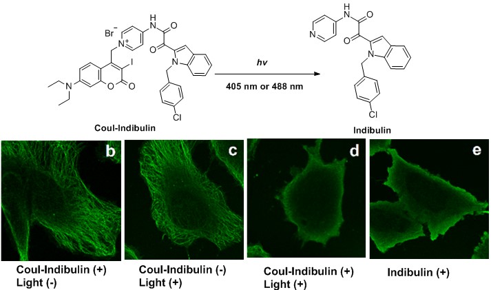 圖2 含有吡啶結(jié)構(gòu)的微管蛋白聚合抑制劑Indibulin在活細(xì)胞內(nèi)光解釋放Indibulin,實現(xiàn)其調(diào)控功能