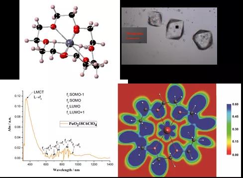 在科工局“長壽命核素分離與化學(xué)行為”科學(xué)挑戰(zhàn)專題、基金委化學(xué)部“乏燃料后處理復(fù)雜體系中的錒系元素化學(xué)研究”重大項(xiàng)目和基金委杰出青年基金等的支持下,蘇州大學(xué)放射醫(yī)學(xué)與輻射防護(hù)國家重點(diǎn)實(shí)驗(yàn)室王殳凹、清華大學(xué)化學(xué)系李雋和中國工程物理研究院的汪小琳合作開展了國內(nèi)第一例钚的實(shí)驗(yàn)配位化學(xué)及理論研究,發(fā)現(xiàn)了利用孔穴效應(yīng)和位阻效應(yīng)在氧化還原過程中形成穩(wěn)定的钚非常規(guī)價(jià)態(tài)的方法,獲得了國內(nèi)首個(gè)钚化合物的晶體結(jié)構(gòu),并首次通過放射性實(shí)驗(yàn)獲得了固體中五價(jià)钚的電子躍遷譜(圖1)。這是國際上制備的首例钚的冠醚類化合物。