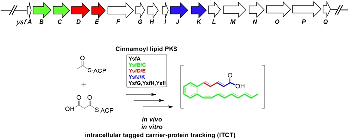肉桂酰脂是重要的活性天然產(chǎn)物結(jié)構(gòu)單元,然而,其分子組裝機(jī)制一直是未解之謎。研究團(tuán)隊采用異源表達(dá)、基因阻斷、體外重構(gòu)等策略對其組裝機(jī)制進(jìn)行了剖析,發(fā)現(xiàn)由3對在進(jìn)化上不同的獨特II型聚酮合酶組成的生物合成體系負(fù)責(zé)了其骨架組裝,整個過程發(fā)生在酰基載體蛋白上,這也對揭開其生物合成機(jī)制的面紗帶來了巨大挑戰(zhàn)。團(tuán)隊成員另辟蹊徑,通過在?;d體蛋白引入親和標(biāo)簽,開發(fā)了新穎的體內(nèi)追蹤中間體的有效方法intracellular tagged carrier-protein tracking (ITCT),成功在生物體內(nèi)追蹤到生物合成過程中的關(guān)鍵中間體,揭示了一個依賴于異構(gòu)酶的“類模塊化”的碳骨架組裝模式。本研究對肉桂酰骨架進(jìn)行理性改造,為獲得活性更優(yōu)的含有肉桂酰結(jié)構(gòu)單元的藥物先導(dǎo)物提供了科學(xué)理論指導(dǎo),也為解析生物體內(nèi)廣泛存在的?;鞍滓蕾囆陨锖铣蛇^程,提供了嶄新的研究思路和策略。