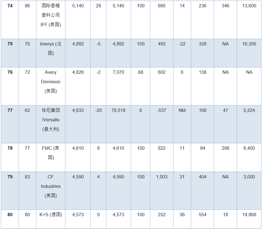 在過去的幾年里,公司并購還對本排行榜產生了另一個影響——入榜公司數(shù)量有所減少。盡管陶氏杜邦公司被拆分為三家,但由于資產剝離等原因歷史上銷售收入達30億美元左右的公司,如亞仕蘭和普立萬,在本年度排名中退至100名以后。