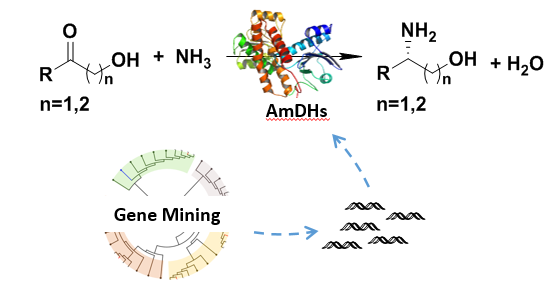 手性胺醇化合物是合成許多重要藥物(如:抗結(jié)核桿菌藥物乙胺丁醇,抗艾滋病藥物度魯特韋,抗菌藥物帕蘇沙星)的前體。目前制備該類化合物主要通過(guò)傳統(tǒng)化學(xué)法和生物酶拆分法,前者依賴重金屬而后者轉(zhuǎn)化率僅有50%。經(jīng)氨基酸脫氫酶(AADHs)定向進(jìn)化而來(lái)的胺脫氫酶(AmDHs)能夠以廉價(jià)的氨作為氨基供體,不對(duì)稱還原胺化潛手性羥酮生成手性胺醇化合物,理論轉(zhuǎn)化率可達(dá)100%,且副產(chǎn)物只有水,是理想的綠色合成途徑。國(guó)內(nèi)外相關(guān)報(bào)道屈指可數(shù),如何快速挖掘獲得高性能AmDHs是綠色生物合成手性胺醇領(lǐng)域面臨的重要難題。