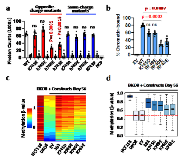 為了驗(yàn)證酸性補(bǔ)丁相互作用對(duì)核小體募集的重要性,研究團(tuán)隊(duì)對(duì)精氨酸指(R740和R743)進(jìn)行了突變分析,并以遠(yuǎn)離酸性補(bǔ)丁區(qū)域的氨基酸(K745和R749)作為對(duì)照。體外相互作用實(shí)驗(yàn)(ALPHA Screen)顯示,相互作用核心區(qū)域740和743精氨酸指相反電荷的突變顯著減弱了DNMT3A2/3B3與核小體的相互作用,而非核心區(qū)域或者相同電荷的突變則如預(yù)期,結(jié)合能力沒(méi)有顯著變化。細(xì)胞內(nèi)染色質(zhì)結(jié)合能力實(shí)驗(yàn)(chromatin association assay)也證實(shí)與酸性補(bǔ)丁相互作用740和743精氨酸指的突變導(dǎo)致與染色質(zhì)的結(jié)合顯著降低。DNA甲基化陣列(Infinium MethylationEPIC BeadChip)同樣證實(shí)了DNMT3B3與核小體酸性補(bǔ)丁之間的相互作用對(duì)于體內(nèi)DNA甲基化重建的重要性。突變體DNMT3B3恢復(fù)DNA甲基化的能力和其與染色質(zhì)的結(jié)合能力密切相關(guān)。作為對(duì)照的K745和R749突變,甲基化恢復(fù)水平幾乎與野生型DNMT3B3一樣。相反,顯著降低與染色質(zhì)結(jié)合的R740E和R743E突變,甲基化恢復(fù)效率低得多。有限的微球菌核酸酶消化實(shí)驗(yàn)(MNase digestion)進(jìn)一步證實(shí)了存在DNMT復(fù)合物的情況下,核小體的任一側(cè)都顯著增加了約10 堿基對(duì)的保護(hù)區(qū)域。這些數(shù)據(jù)強(qiáng)烈支持DNMT復(fù)合物的類(lèi)催化結(jié)構(gòu)域與酸性補(bǔ)丁相互作用對(duì)于核小體募集和DNA甲基化的重要性,并且與DNA的結(jié)合并不依賴(lài)于酶的活性位點(diǎn)CpG。