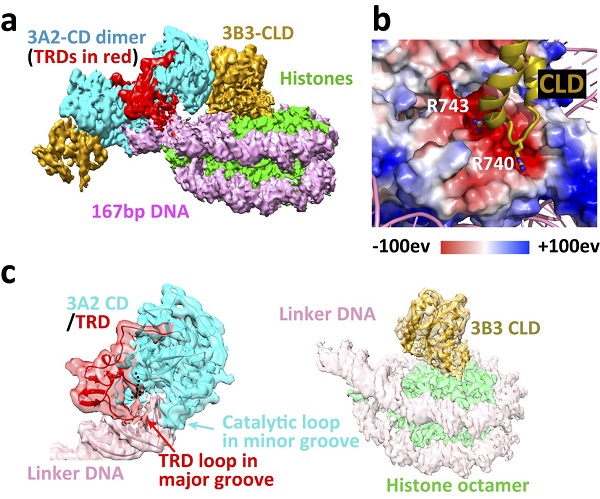 a, 復(fù)合物結(jié)構(gòu)的冷凍電鏡電子密度圖; b, 酸性補(bǔ)丁相互作用; c, DNMT3A2 催化結(jié)構(gòu)域與連接DNA相互作用和DNMT3B3類(lèi)催化結(jié)構(gòu)域與核小體核心相互作用。