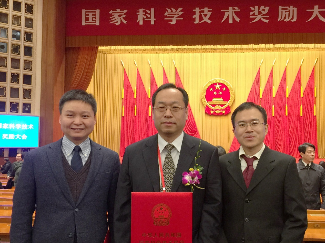 張錦團(tuán)隊(duì)獲2017年度國家自然科學(xué)二等獎,國家科技獎勵大會后張錦團(tuán)隊(duì)的合影(左起:彭海琳、張錦、童廉明)