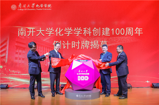 紀(jì)念活動(dòng)啟動(dòng)儀式現(xiàn)場(chǎng),發(fā)布了南開大學(xué)化學(xué)學(xué)科創(chuàng)建100周年公告(第一號(hào))。曹雪濤、陳軍、李靖與化學(xué)學(xué)院負(fù)責(zé)人共同為南開大學(xué)化學(xué)學(xué)科創(chuàng)建100周年倒計(jì)時(shí)牌揭幕。