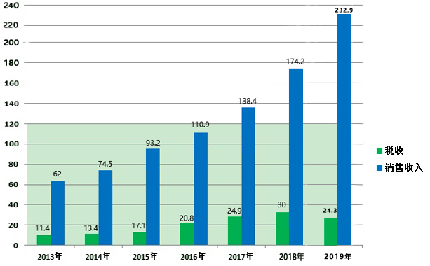 2019年,公司實現(xiàn)營業(yè)收入232.9億元,同比增長33.7%;稅收24.3億元。