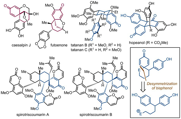 含有多個手性中心的螺環(huán)二烯酮結(jié)構(gòu)廣泛存在于天然產(chǎn)物和生物活性分子中。如caesalpin J和futoenone是從在傳統(tǒng)中藥中分離得到的天然產(chǎn)物,分別具有潛在的抗炎癥活性和抑制基質(zhì)金屬蛋白酶的活性。一些含有苯酚取代螺環(huán)二烯酮衍生物同樣具有廣泛的生物活性。如tatanan B和tatanan C,是從Acorus tatarinowii Schott根莖中分離得到,被報道具有抗糖尿病活性。hopeanol則具有潛在的抗腫瘤活性。此外spirotriscoumarins A和spirotriscoumarins B也被報道具有抗甲型流感病毒活性。從逆合成分析角度來看,利用去對稱化策略發(fā)展雙苯酚衍生物的去芳構(gòu)化反應(yīng),將為構(gòu)筑該類手性骨架提供最為直接的方法。