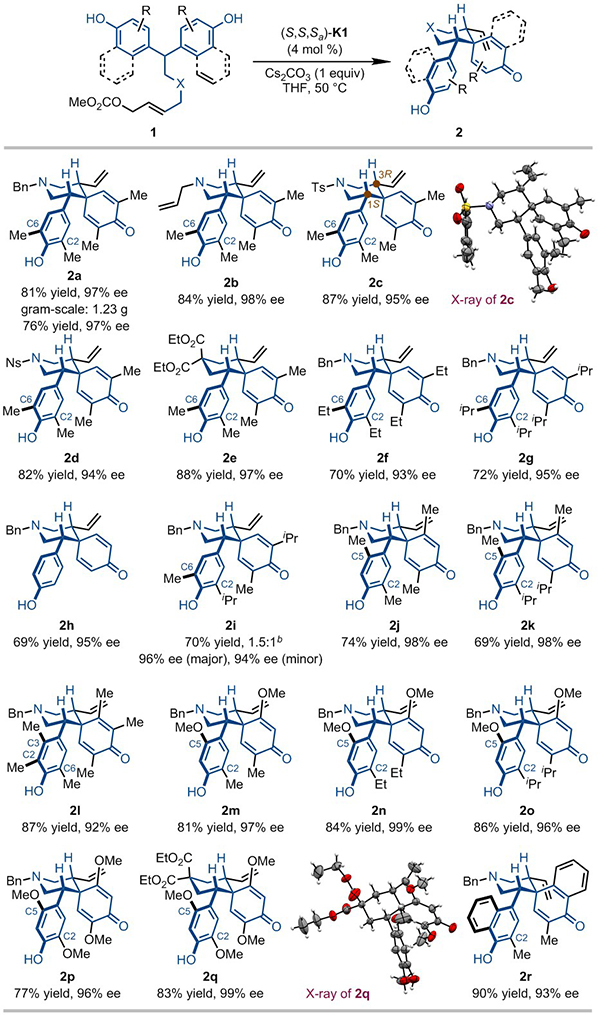 研究人員發(fā)現(xiàn),在優(yōu)化條件下各類含富電子取代基的雙苯酚衍生物均以優(yōu)秀的立體選擇性得到含多個手性中心的環(huán)己二烯酮化合物,且所有反應(yīng)均在30分鐘內(nèi)結(jié)束。反應(yīng)能擴大至克級規(guī)模,收率和立體選擇性不受影響。