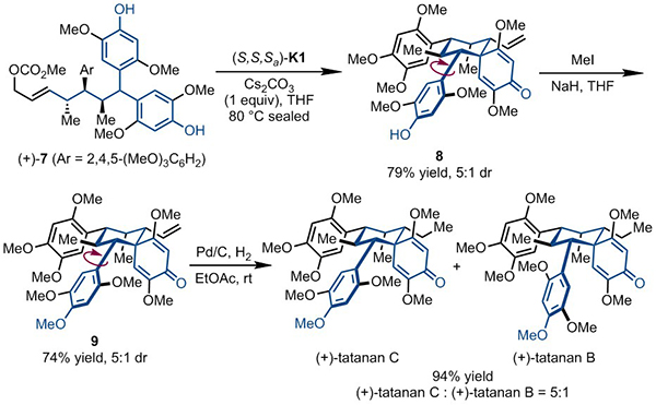 該方法可應(yīng)用于天然產(chǎn)物tatanan B和tatanan C的合成。雙苯酚前體(+)-7可在手性銥絡(luò)合物(S,S,Sa)-K1的作用下發(fā)生不對稱烯丙基去芳構(gòu)化反應(yīng)以79%的收率得到一對阻旋異構(gòu)體8,后者再經(jīng)過兩步反應(yīng)即可得到天然產(chǎn)物tatanan C和tatanan B的混合物(5:1),且無其他非對映異構(gòu)體生成。該結(jié)果優(yōu)于文獻已知報道。