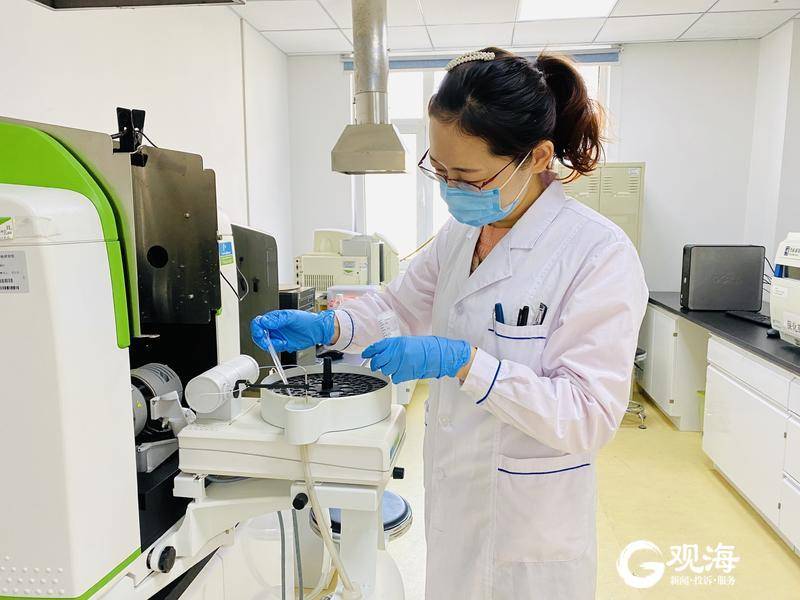 檢測人員將樣品溶液放入原子光譜儀。