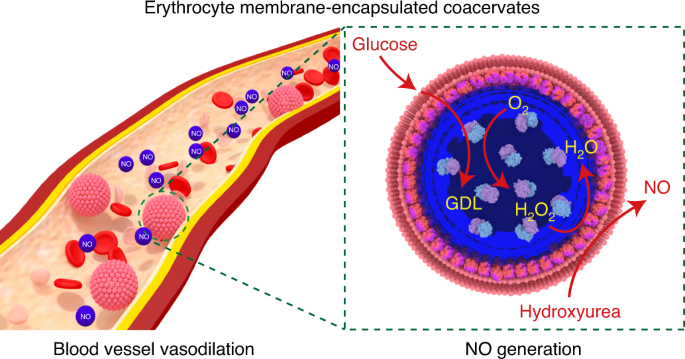 該工作基于液液相分離技術(shù)制備了凝集體液滴,以其作為載體包載葡萄糖氧化酶,并在其表面包覆紅細(xì)胞膜磷脂碎片,構(gòu)建了具有紅細(xì)胞膜結(jié)構(gòu)的人造細(xì)胞。紅細(xì)胞膜的包被提高了凝集體人造細(xì)胞的穩(wěn)定性,延長了人造細(xì)胞在體內(nèi)的血液循環(huán)時(shí)間。人造細(xì)胞中的葡萄糖氧化酶利用體內(nèi)的葡萄糖產(chǎn)生過氧化氫,過氧化氫在紅細(xì)胞膜上血紅蛋白的催化下將藥物分子羥基脲轉(zhuǎn)化為一氧化氮信號(hào)分子。體外實(shí)驗(yàn)和活體動(dòng)物實(shí)驗(yàn)均證實(shí)了所產(chǎn)生一氧化氮的血管舒張生理效應(yīng)。