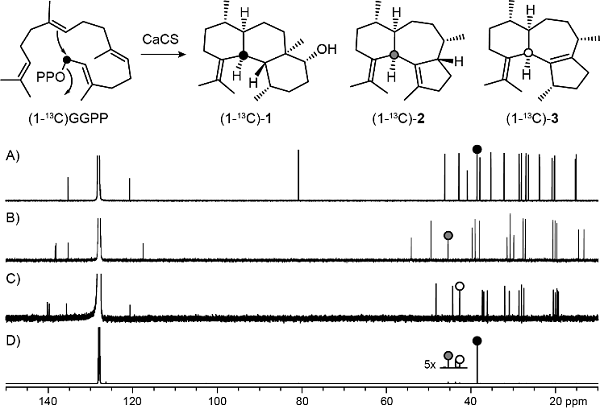 圖3:13C-NMR 譜圖, A) 1, B) 2, C) 3, and D) (1-13C)GGPP 與CaCS孵育的同位素標記實驗結(jié)果。圓圈代表13C標記。