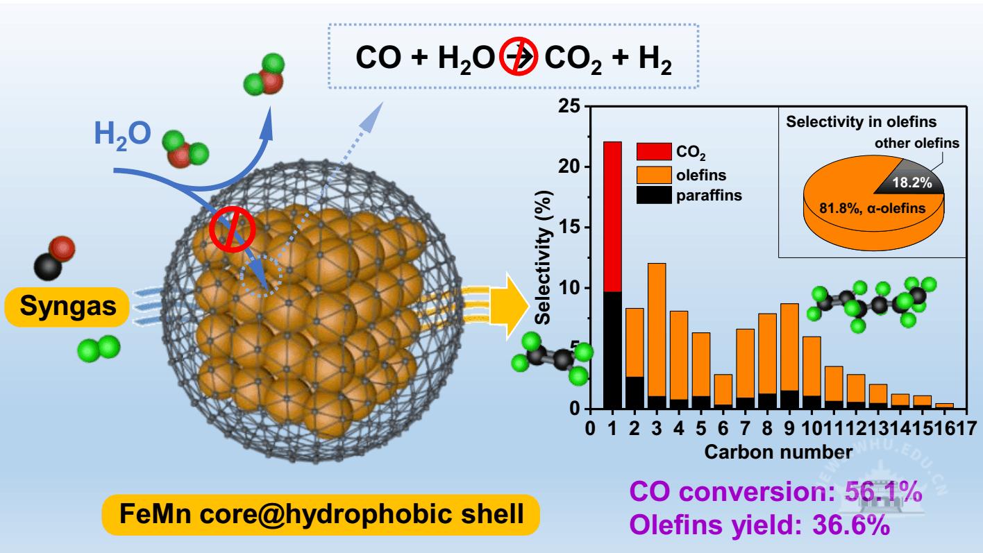 定明月課題組創(chuàng)造性發(fā)展了一種新型疏水性FeMn@Si催化劑,在工業(yè)反應(yīng)條件下(320 °C和 2-3 MPa),實(shí)現(xiàn)了合成氣高選擇性直接制取烯烴,二氧化碳和甲烷等C1副產(chǎn)物顯著降低到22.5%以下,烯烴選擇性可達(dá)65%(烯烴中高附加值α-烯烴選擇性可達(dá)81%以上),烯烴產(chǎn)率高達(dá)36%以上。