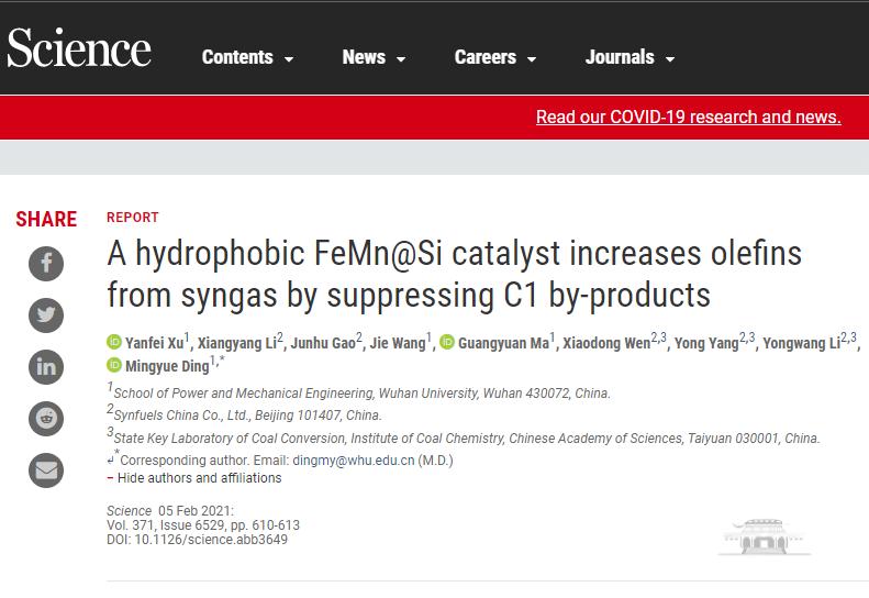 論文題為“A hydrophobic FeMn@Si catalyst increases olefins from syngas by suppressing C1 by-products”(《一種通過(guò)抑制C1副產(chǎn)物促進(jìn)合成氣制烯烴的疏水性FeMn@Si催化劑》)。武漢大學(xué)動(dòng)力與機(jī)械學(xué)院2019級(jí)博士生徐艷飛為論文第一作者,定明月為通訊作者,武漢大學(xué)為唯一第一作者和唯一通訊單位。