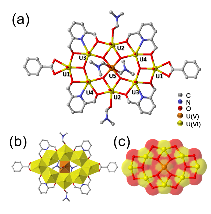 團(tuán)隊(duì)采用了常規(guī)溶劑熱法,以硝酸鈾酰、有機(jī)硼酸酯和苯甲酸為原料,通過(guò)原位還原獲得了一種新的V/VI混合價(jià)態(tài)鈾簇(1),該化合物是目前最大的基于“tetraoxo核”的混價(jià)鈾簇。單晶衍射數(shù)據(jù)顯示化合物1為九核簇,其中包括一個(gè)U(V)和八個(gè)U(VI)。U(V)為六配位模式,平面有四個(gè)μ3-O原子、軸向?yàn)閮蓚€(gè)DMF分子提供的O原子,為典型的“tetraoxo核”;其余八個(gè)U(VI)為平面五配位、兩個(gè)軸向鈾酰氧的五角雙錐構(gòu)型。
