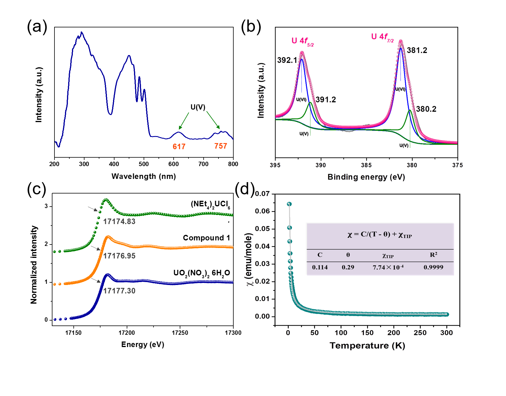 拓展含鈾化合物的應(yīng)用對(duì)于優(yōu)化貧鈾利用與理解固體中5f電子行為等具有重要意義。鈾具有三、四、五、六等多個(gè)價(jià)態(tài)和化學(xué)種態(tài)。另外,鈾元素的5f和6d軌道均具成鍵能力,使得鈾元素往往呈現(xiàn)出異于過(guò)渡金屬和鑭系元素的獨(dú)特性質(zhì)。近年來(lái),研究人員在單一價(jià)態(tài)鈾化合物的合成和功能應(yīng)用方面已取得了眾多進(jìn)展。例如,UIII化合物具有高效的小分子活化和催化轉(zhuǎn)化能力;UIV化合物表現(xiàn)出優(yōu)異的超導(dǎo)性質(zhì);UVI化合物是潛在的光功能材料?;旌蟽r(jià)態(tài)鈾化合物結(jié)合兩個(gè)或兩個(gè)以上差異較大的鈾離子,其應(yīng)用與性質(zhì)更具潛力。然而,過(guò)去二十年內(nèi),該領(lǐng)域研究普遍聚焦混合價(jià)態(tài)鈾化合物制備、配位化學(xué)以及電子結(jié)構(gòu)等研究,未見(jiàn)混合價(jià)態(tài)鈾化合物作為功能材料的相關(guān)報(bào)道。