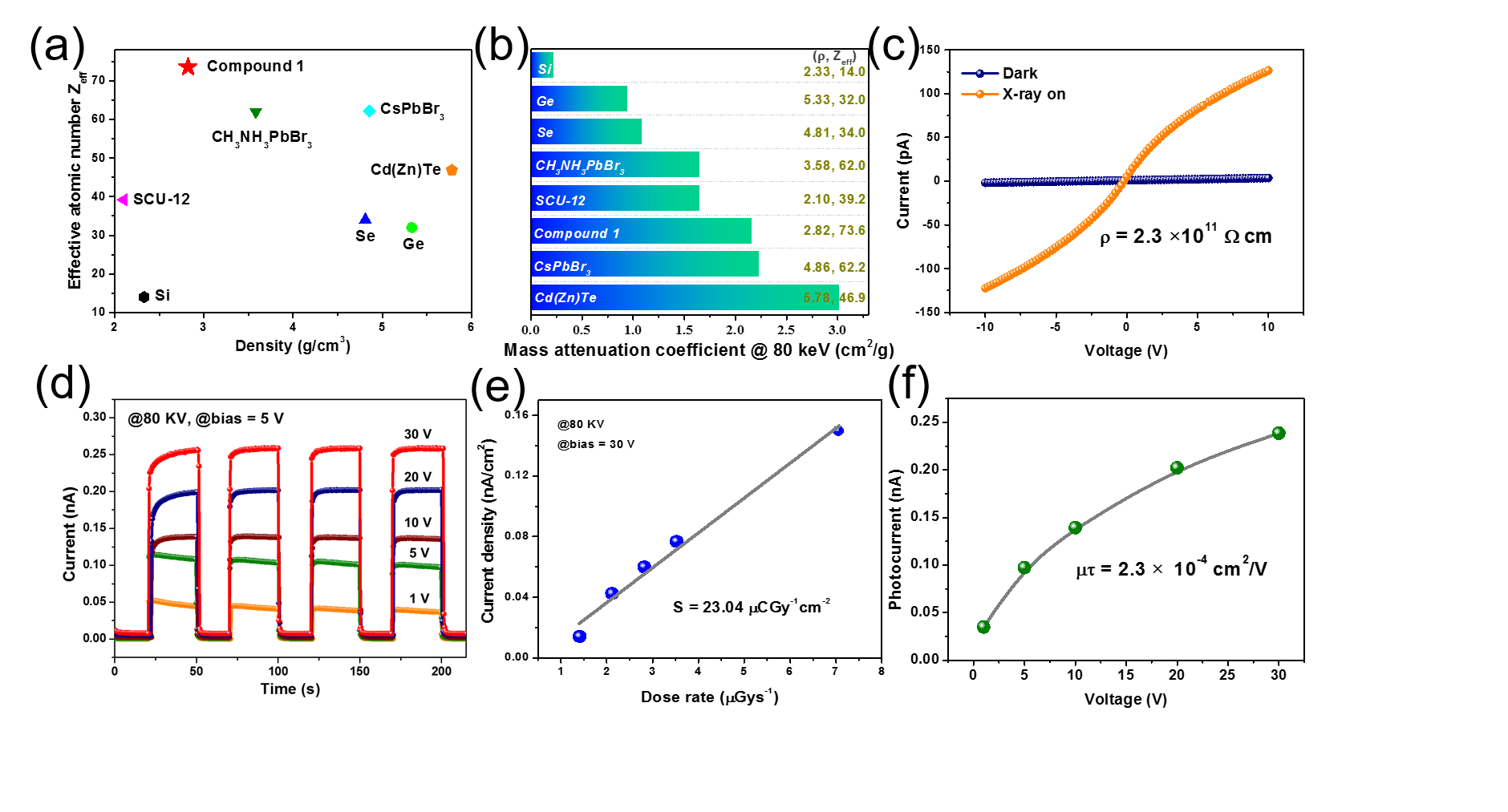 得益于鈾簇的多核特性,化合物1是目前為止有效原子序數(shù)最大的半導(dǎo)體輻射探測(cè)材料。進(jìn)一步通過(guò)器件組裝與輻射探測(cè)性能評(píng)估,研究人員證明化合物1在X射線探測(cè)領(lǐng)域具有巨大的潛在優(yōu)勢(shì)。其具有高達(dá)500的開(kāi)關(guān)比、可觀的電荷遷移率壽命積(μτ, 2.3×10-4 cm2/V)和高的射線檢測(cè)靈敏度(23.4 μC Gyair-1 cm-2)。