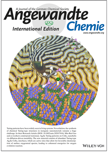 近日,中國科學(xué)技術(shù)大學(xué)高敏銳教授研究組利用“反應(yīng)-擴散”的機制,首次實現(xiàn)了在無機過渡金屬硫族化合物上圖靈結(jié)構(gòu)的構(gòu)筑。在二乙烯三胺(DETA)與水的二元溶液中,Ag+會和DETA發(fā)生絡(luò)合反應(yīng)形成Ag(DETA)+,其擴散系數(shù)為3.518×10-6cm2s-1。同時,Co2+從二硒化鈷(CoSe2)納米帶表面溢出,其擴散系數(shù)為2.317×10-7cm2s-1。因此,在該系統(tǒng)中,Ag(DETA)+是抑制劑而Co2+是激活劑??焖贁U散的Ag(DETA)+到達CoSe2表面的能斯特層(Nernst layer)時,與擴散到CoSe2表面的激活劑Co2+發(fā)生作用,最終在CoSe2表面形成復(fù)雜美麗的Ag2Se圖靈圖案(圖2)。相關(guān)研究成果以“An Efficient Turing-Type Ag2Se-CoSe2Multi-Interfacial Oxygen-Evolving Electrocatalyst”為題發(fā)表在《德國應(yīng)用化學(xué)》雜志上(Angew. Chem. Int. Ed.2021, 60,doi.org/10.1002/anie.202017016),并被選為Hot Paper和Back Cover(圖3)。論文的共同第一作者為中科大博士研究生張曉隆和楊朋朋。