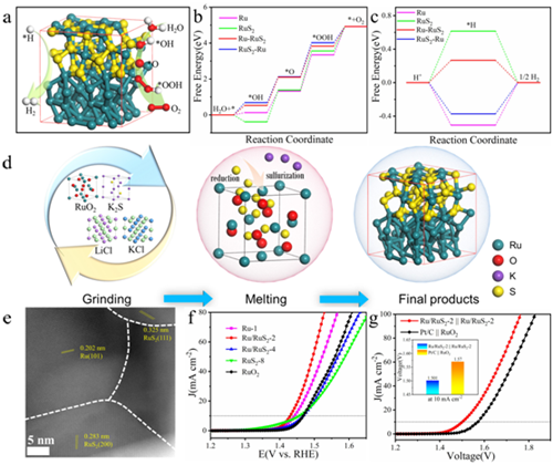對(duì)此,木士春教授團(tuán)隊(duì)對(duì)Ru基異質(zhì)介面的電子結(jié)構(gòu)、活性起源及酸性析氫、析氧及全水解電催化性能進(jìn)行了深入探究。首先,通過(guò)密度泛函理論(DFT)理論計(jì)算發(fā)現(xiàn)釕/二硫化釕(Ru/RuS2)異質(zhì)介面具有較高的電子態(tài),且其界面上存在明顯的電荷轉(zhuǎn)移趨勢(shì),使得表面Ru原子對(duì)催化中間體的吸附能得到優(yōu)化,從而降低了反應(yīng)能壘,提高了本征活性。繼而,利用熔鹽體系下硫化鉀的同步還原與硫化作用,獲得了新穎的Ru/RuS2異質(zhì)介面結(jié)構(gòu)催化材料。電化學(xué)測(cè)試表明,在酸性介質(zhì)下,Ru/RuS2展示出極低的析氧(201 mV @ 10 mA cm-2)、析氫過(guò)電位(45 mV @ 10 mA cm-2)及優(yōu)異的循環(huán)穩(wěn)定性。將其用于質(zhì)子交換膜電解水系統(tǒng)時(shí),僅需1.501 V電壓值就可達(dá)到10 mA cm-2的電流密度。該項(xiàng)研究成果將為異質(zhì)界面結(jié)構(gòu)的理性設(shè)計(jì)與可控構(gòu)筑提供指導(dǎo)。