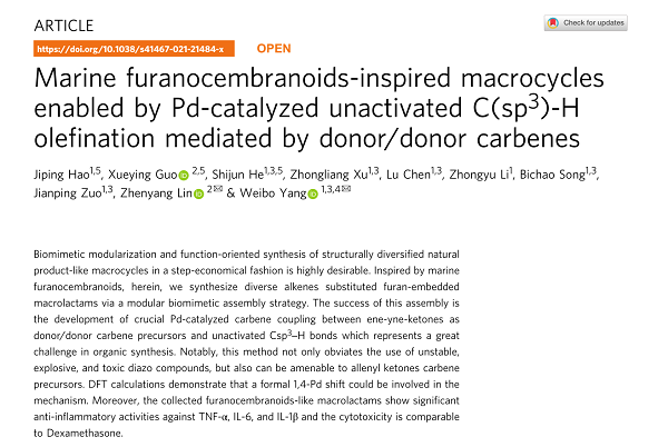 [1] Nat Commun:上海藥物所楊偉波課題組合成具有抗炎活性的類天然呋喃大環(huán)內(nèi)酰胺化合物http://www.simm.ac.cn/web/xwzx/kydt/202103/t20210301_5962153.html