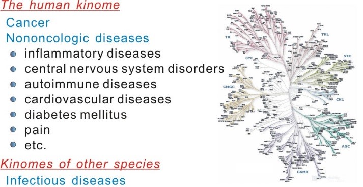 小分子激酶抑制劑作為癌癥靶向治療藥物已經(jīng)獲得巨大成功。例如,2020年美國FDA批準(zhǔn)的38個(gè)小分子藥物中,激酶抑制劑就占8個(gè),用于治療多種類型的癌癥。然而,激酶表達(dá)失調(diào)并非只與腫瘤相關(guān),也與多種其他疾病關(guān)聯(lián)。研究表明,除了作為癌癥疾病靶點(diǎn),激酶還可以作為炎癥、自身免疫性疾病、心血管疾病、糖尿病、中樞神經(jīng)性疾病及各類傳染?。ㄈ缧鹿诜窝缀童懠玻┑榷囝惣膊〉膬?yōu)勢(shì)靶點(diǎn)。然而,出于安全性的考慮,針對(duì)這些疾病開發(fā)小分子激酶抑制劑藥物難度很大。盡管如此,自2011年以來,F(xiàn)DA批準(zhǔn)了10個(gè)可治療非腫瘤疾病的小分子激酶抑制劑。