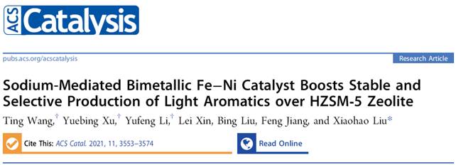 費(fèi)托合成是將合成氣(H2/CO/CO2)直接轉(zhuǎn)化為超清潔燃料和高價(jià)值化學(xué)品的重要技術(shù)途徑。鐵基催化劑是常用的費(fèi)托合成催化劑,它與烴類產(chǎn)物在HZSM-5上催化轉(zhuǎn)化為芳烴具有相匹配的反應(yīng)條件,這為將兩種催化劑耦合在單反應(yīng)器中一步催化合成氣轉(zhuǎn)化制芳烴成為可能。然而,這兩類催化劑在固定床反應(yīng)器中均容易失活,且反應(yīng)過程極其多樣復(fù)雜、難于控制,這使得合成氣(CO/H2)在單反應(yīng)器中一步高效制芳烴極具挑戰(zhàn)。江南大學(xué)劉小浩團(tuán)隊(duì)創(chuàng)造性地構(gòu)建Na調(diào)節(jié)的Fe-Ni雙金屬費(fèi)托催化劑用于這一催化過程,同時(shí)解決了兩類催化劑(金屬與分子篩)的穩(wěn)定性和選擇性存在的問題(圖2)。