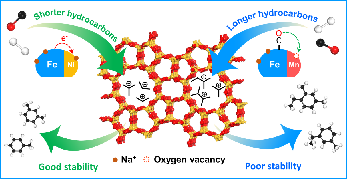 具體結(jié)論如下:(1)少量的Ni引入Fe基費(fèi)托催化劑,F(xiàn)e向Ni轉(zhuǎn)移電子能有效地抑制了碳沉積,從而顯著提高了費(fèi)托催化劑的穩(wěn)定性。(2)Fe向Ni轉(zhuǎn)移電子也改變了Fe的碳化行為,導(dǎo)致反應(yīng)過程中形成了更多的Fe3C活性中心,有利于提高費(fèi)托產(chǎn)物中低碳烯烴(C2=-C4=)選擇性;特別有趣的是,F(xiàn)e-Ni界面的形成不但抑制了表面CH2*物種的連續(xù)加氫生成不期望的CH4產(chǎn)物,而且形成的表面短鏈物種CnH2n*難于進(jìn)行鏈增長、容易脫附生成低碳烯烴。這主要是由于界面處電子積聚而引起的電子排斥效應(yīng),減弱了CH2*和短鏈物種與活性中心的結(jié)合強(qiáng)度。此外,Ni從Fe得到電子也改變了Ni的本征催化行為,減弱了不期望的甲烷化反應(yīng)。(3)研究發(fā)現(xiàn),過多的Na助劑添加將顯著減弱Fe-Ni的相互作用,抑制了Fe向Ni轉(zhuǎn)移電子,使Ni呈現(xiàn)其本征催化特性,它的強(qiáng)加氫能力大幅提高了不期望的低碳烷烴選擇性。(4)研究表明費(fèi)托產(chǎn)物分布能顯著影響HZSM-5分子篩的穩(wěn)定性和芳烴選擇性。如FeNiOx(5:1)-0.41Na-HZSM-5催化劑中Fe向Ni轉(zhuǎn)移電子,導(dǎo)致C5+中低碳數(shù)產(chǎn)物的選擇性大幅增加,這些產(chǎn)物在HZSM-5上催化轉(zhuǎn)化主要生成高價(jià)值的輕質(zhì)芳烴(液相產(chǎn)物中總芳烴選擇性達(dá)到~98.6%,其中甲苯、乙苯和二甲苯輕質(zhì)芳烴選擇性為~65.7%),且具有較好的催化穩(wěn)定性,提高的催化穩(wěn)定性可能得益于低碳數(shù)費(fèi)托產(chǎn)品的裂解異構(gòu)、生成輕質(zhì)芳烴和Ni強(qiáng)的氫氣解離能力引起的氫溢流至HZSM-5上大幅降低積碳。相反,F(xiàn)eMnOx(5:1)-0.40Na-HZSM-5催化劑由于MnOx中的氧空位提升CO解離,導(dǎo)致C5+中高碳數(shù)產(chǎn)物的選擇性顯著增加,這些費(fèi)托產(chǎn)物在HZSM-5上催化轉(zhuǎn)化生成了更多的不期望的多支鏈單環(huán)芳烴,分子篩的穩(wěn)定性也明顯下降。(5)研究過程中同時(shí)發(fā)現(xiàn),兩種催化劑在顆粒混合時(shí),費(fèi)托催化劑上的Na+能遷移至HZSM-5分子篩上,毒化外表面酸性位,抑制H轉(zhuǎn)移反應(yīng),從而避免了低碳烯烴加氫生成不期望的低碳烷烴,大幅提高了氣相產(chǎn)物中低碳烯烴選擇性。
