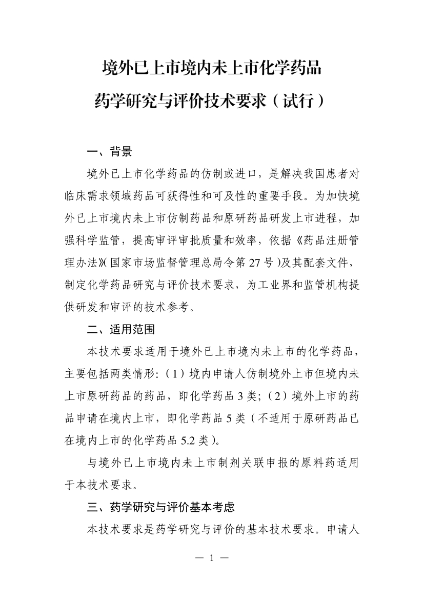 國家藥監(jiān)局藥審中心發(fā)布《境外已上市境內(nèi)未上市化學(xué)藥品藥學(xué)研究與評(píng)價(jià)技術(shù)要求(試行)》