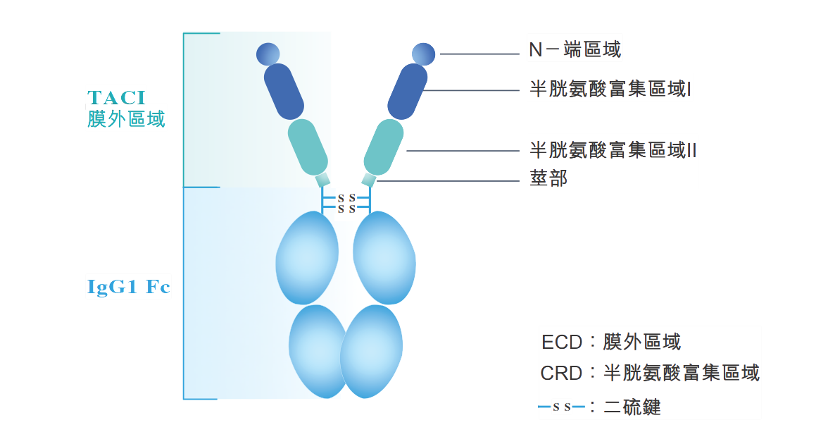 泰它西普(RC18,商品名:泰愛(ài))是榮昌生物專有用于治療自身免疫性疾病的新型融合蛋白,由人跨膜激活劑及鈣調(diào)親環(huán)素配體相互作用因子(TACI)受體的胞外域以及人免疫球蛋白G (IgG)的可結(jié)晶片段(Fc)域構(gòu)成。泰它西普靶向兩類對(duì)B淋巴細(xì)胞發(fā)育至關(guān)重要的細(xì)胞信號(hào)分子:B淋巴細(xì)胞刺激因子(BLyS)和增殖誘導(dǎo)配體(APRIL),得以有效降低B細(xì)胞介導(dǎo)的自身免疫應(yīng)答,自身免疫應(yīng)答與多種自身免疫性疾病有關(guān)。