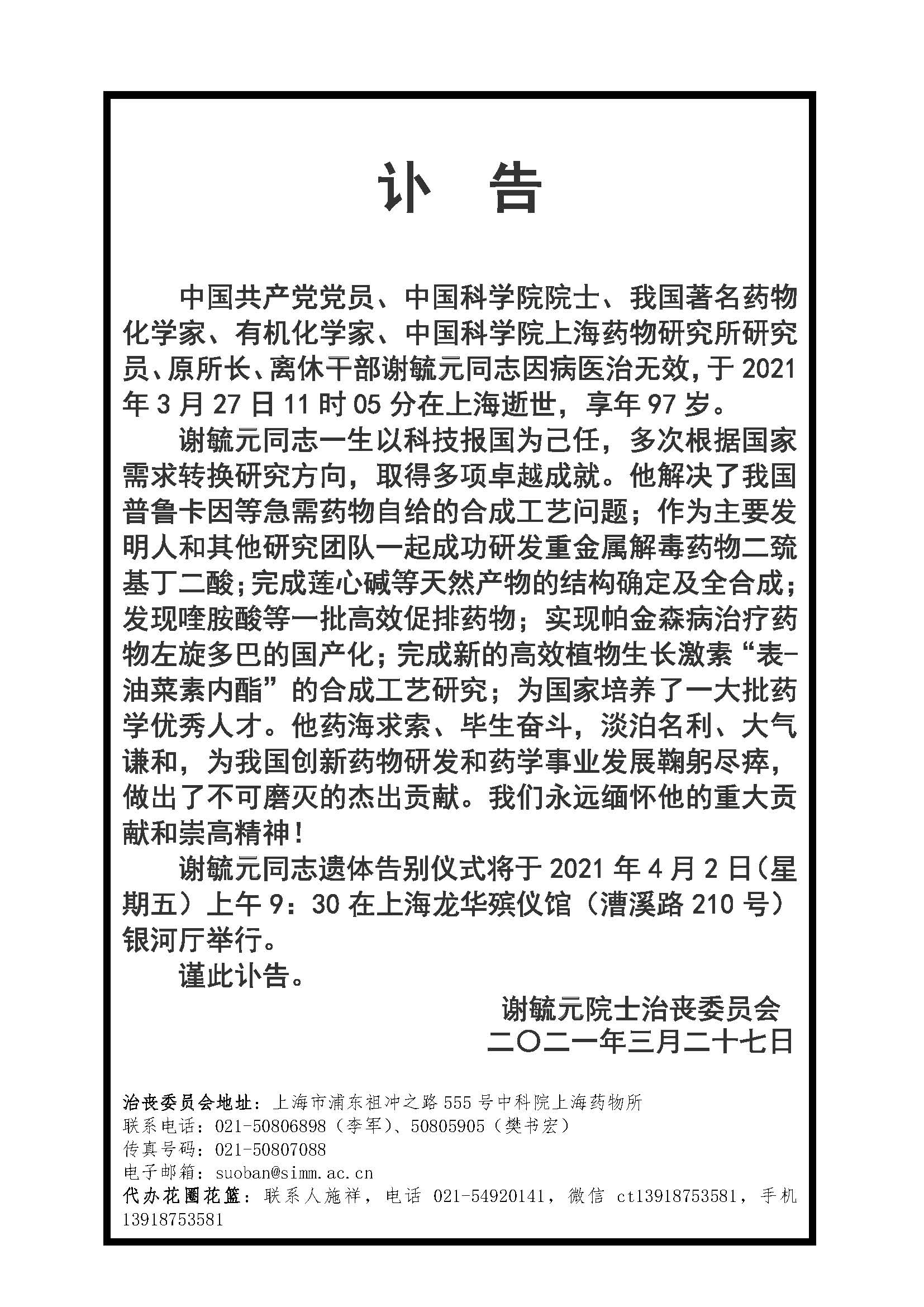 謝毓元同志1924年4月19日出生于北京,祖籍江蘇蘇州。1949年7月獲清華大學(xué)理學(xué)士學(xué)位,8月留校任助教,1951年2月進(jìn)入中國(guó)科學(xué)院上海藥物研究所(時(shí)為中國(guó)科學(xué)院有機(jī)化學(xué)研究所藥物研究室)工作至離休。謝毓元同志1956年加入中國(guó)共產(chǎn)黨,1961年獲得前蘇聯(lián)科學(xué)院天然有機(jī)化學(xué)研究所副博士學(xué)位,1991年當(dāng)選中國(guó)科學(xué)院學(xué)部委員(院士)。