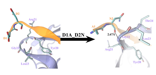 圖3:APP 9-mer雙突變D1AD2N引起的結(jié)合復(fù)合物結(jié)構(gòu)變化