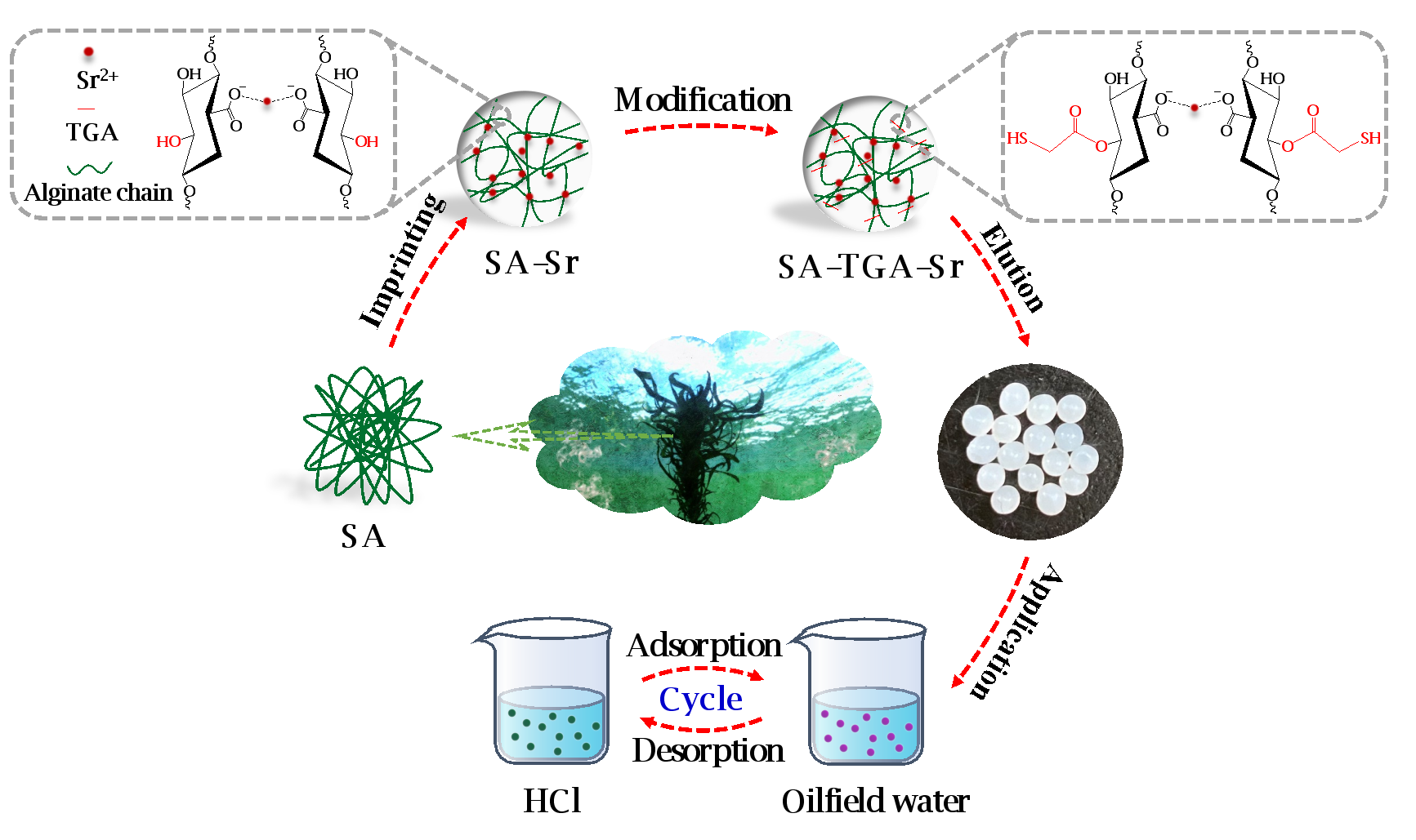 《Chemical Engineering Journal》(2021, 410: 128267)刊登了“Selective recovery of strontium from oilfield water by ion-imprinted alginate microspheres modified with thioglycollic acid”。該文第一作者為博士生劉燦,通訊作者為余曉平副研究員和鄧天龍教授,天津科技大學為第一署名單位和通訊作者單位。針對鹵水中鍶的分離提取,該團隊以親水性海藻酸鈉(SA)為基體材料進行吸附提鍶研究。通過以Sr2+進行離子印跡,并經(jīng)造粒成型和TGA改性后,材料的吸附容量高達177 mg/g,遠高于國內(nèi)外已報道的吸附提鍶材料,具有重要的工業(yè)應(yīng)用前景。
