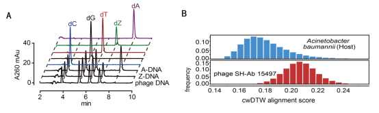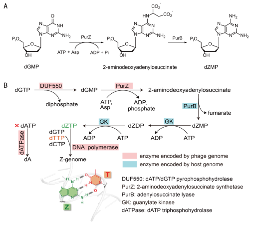 DNA是生命體的遺傳物質(zhì),決定生物的多樣性和特征。生命的遺傳信息存儲在由A、G、C、T四種堿基組成的DNA序列中。DNA四種堿基互補(bǔ)作用的雙螺旋結(jié)構(gòu)1953年由美國科學(xué)家沃特森和英國科學(xué)家克里克揭示,構(gòu)成生命中心法則的基礎(chǔ),二人因此獲得諾貝爾獎。目前唯一的例外是1977年前蘇聯(lián)科學(xué)家在感染藍(lán)細(xì)菌的一株噬菌體中發(fā)現(xiàn)由Z、G、C、T組成的DNA。這類特殊DNA用二氨基嘌呤(Z)完全取代正常的腺嘌呤(A),與胸腺嘧啶(T)配對,形成更穩(wěn)定的三個氫鍵,極大地改變了DNA的物理化學(xué)特征,然而這類特殊DNA的合成機(jī)制及普遍性一直未解。以上研究團(tuán)隊(duì)找到了催化這一特殊DNA合成的多個酶,不僅涉及Z的合成,還包括A的消除。盡管DNA測序非常普及,但由于普通DNA測序手段并不能發(fā)現(xiàn)Z的存在,該團(tuán)隊(duì)利用酶水解DNA再進(jìn)行組分分析的傳統(tǒng)方法,證實(shí)了地球上廣泛存在含這類特殊DNA的噬菌體,并用最新一代的納米孔DNA測序技術(shù),對結(jié)果進(jìn)行了進(jìn)一步驗(yàn)證。