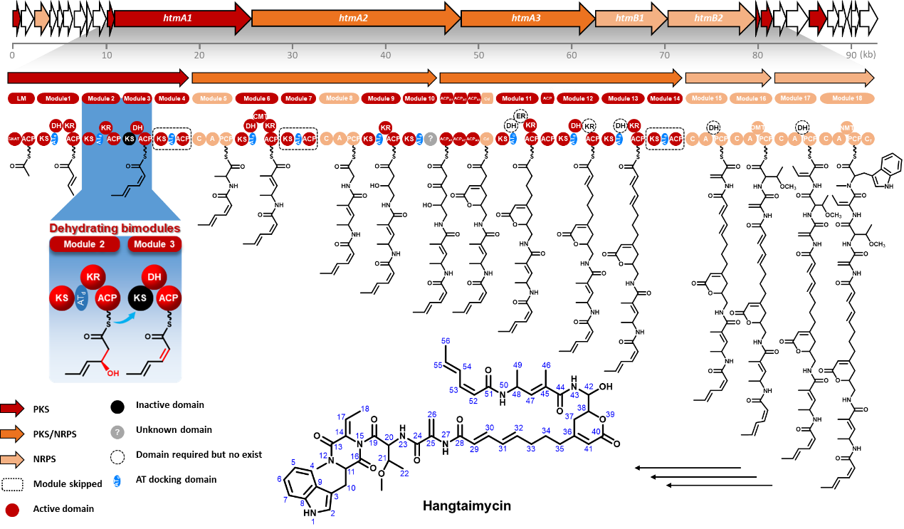 孫宇輝教授課題組前期在微生物活性天然產(chǎn)物的挖掘過程中,從武漢大學(xué)校園土壤中分離到的一株鏈霉菌(Streptomyces spectabilis CCTCC M2017417)中發(fā)現(xiàn)了一類具有抗耐甲氧西林金黃色葡萄球菌(Methicillin-resistant Staphylococcus aureus, MRSA)活性的萘安莎類抗生素曲張鏈絲菌素(Streptovaricins),并對(duì)參與曲張鏈絲菌素的多個(gè)細(xì)胞色素P450酶編碼基因進(jìn)行了全面探索(ACS Chemical Biology, 2017, 12: 2589-2597),揭示了與其中亞甲基雙氧橋結(jié)構(gòu)相關(guān)的生物合成機(jī)制(Nature Communications, 2020, 11: 4501)。在對(duì)這一菌株活性次生代謝產(chǎn)物的進(jìn)一步挖掘過程中,重新分離獲得了媲美一線抗肝損傷臨床藥物水飛薊素的活性先導(dǎo)化合物Hangtaimycin,并糾正了其立體化學(xué)構(gòu)型。通過對(duì)Hangtaimycin的結(jié)構(gòu)及其生物合成基因簇生物信息學(xué)分析,發(fā)現(xiàn)Hangtaimycin的碳骨架化學(xué)結(jié)構(gòu)與催化其生物合成的PKS結(jié)構(gòu)域(Domain)功能之間存在非經(jīng)典線性對(duì)應(yīng),其中HtmA1中四個(gè)模塊(Module)僅負(fù)責(zé)催化兩輪碳鏈延伸。通過與Jeroen S. Dickschat教授課題組,以及藥學(xué)院沈坤副研究員、項(xiàng)瑾副教授團(tuán)隊(duì)合作,運(yùn)用體內(nèi)遺傳失活、底物化學(xué)合成及體外生化重建等方法,證明模塊1僅負(fù)責(zé)一個(gè)不飽和雙鍵單元的延伸,模塊2模塊3以非典型共線性脫水雙模塊的方式,共同催化第二個(gè)Z型雙鍵的形成。