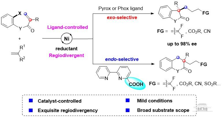 圖2. 配體調(diào)控的區(qū)域發(fā)散性烯烴雙碳官能團化反應(yīng)