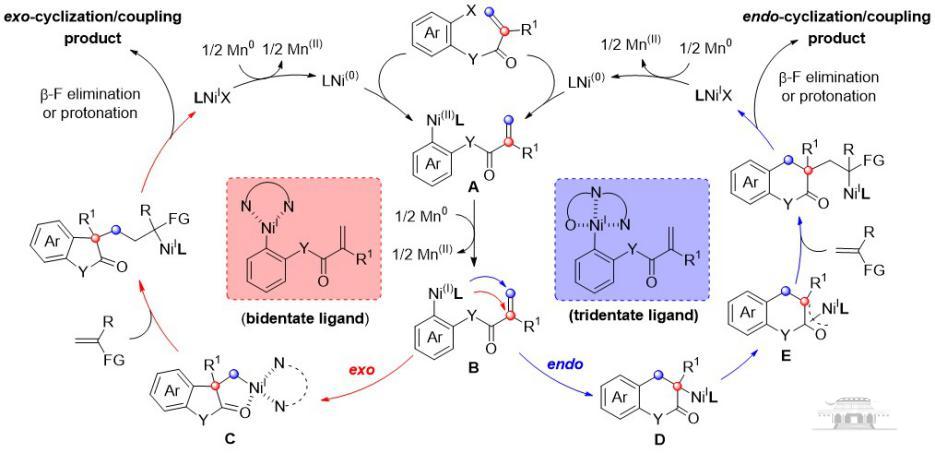 通過大量的機理研究,作者提出了可能的反應(yīng)機理。在還原條件下,原位生成的Ni0與ArBr氧化加成形成ArNiIIX中間體A,并被Mn0還原生成ArNiI中間體B。當使用雙齒配體時,中間體B發(fā)生exo環(huán)化生成σ-烷基-NiI物種C。C對烯烴親核加成或遷移插入,緊接著發(fā)生β-F消除或質(zhì)子化,得到5-exo環(huán)化/交叉偶聯(lián)產(chǎn)物。而當使用羧酸修飾的2,2'-聯(lián)吡啶配體時,由于三齒配體的空間位阻較大,雙鍵末端優(yōu)先遷移到芳基鎳物種上,生成六元環(huán)狀NiI物種D,然后異構(gòu)化生成更穩(wěn)定更親核的π-氧雜-烯丙基-NiI中間體E。中間體E親核加成或遷移插入到烯烴上,然后β-F消除或質(zhì)子化得到6-endo環(huán)化/交叉偶聯(lián)產(chǎn)物。