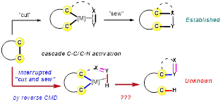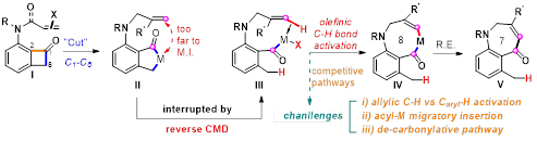 圖2 Reverse CMD作為關(guān)鍵步驟的串聯(lián)C-C/Colefin-H鍵反應(yīng)
