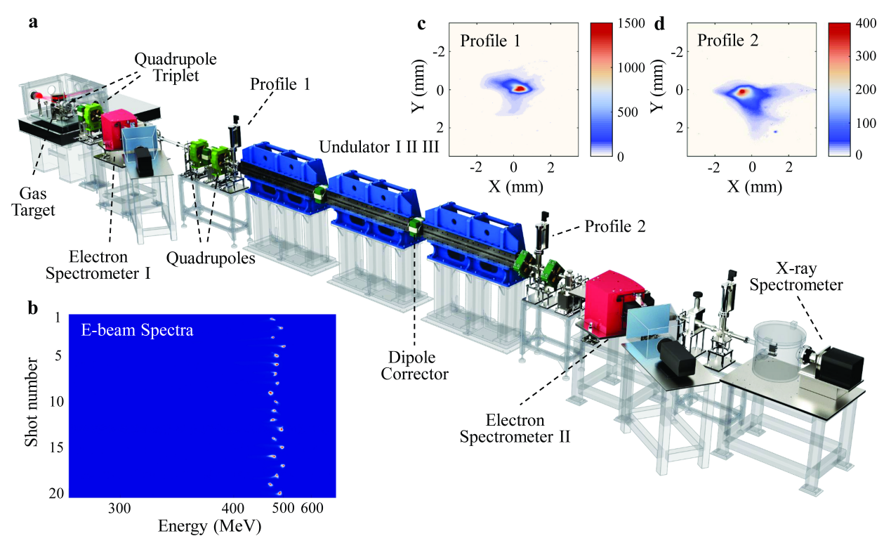 中國科學院上海光學精密機械研究所強場激光物理國家重點實驗室,利用自行研制的具有國際領(lǐng)先綜合性能的超強超短激光裝置,在基于激光加速器的小型化自由電子激光研究方面取得突破性進展。研究團隊通過顯著提升激光尾波場加速的電子束品質(zhì),并結(jié)合創(chuàng)新設(shè)計的緊湊型束流傳輸與輻射系統(tǒng),實驗上首次實現(xiàn)了基于激光加速器的自由電子激光放大輸出,典型激光波長27納米,最短激光波長可達10納米級,單脈沖能量可達100納焦級,國際率先完成了臺式化自由電子激光原理的實驗驗證,對于發(fā)展小型化、低成本自由電子激光器具有重大意義。相關(guān)研究成果于2021年7月22日作為封面文章發(fā)表于《自然》(Nature)雜志。