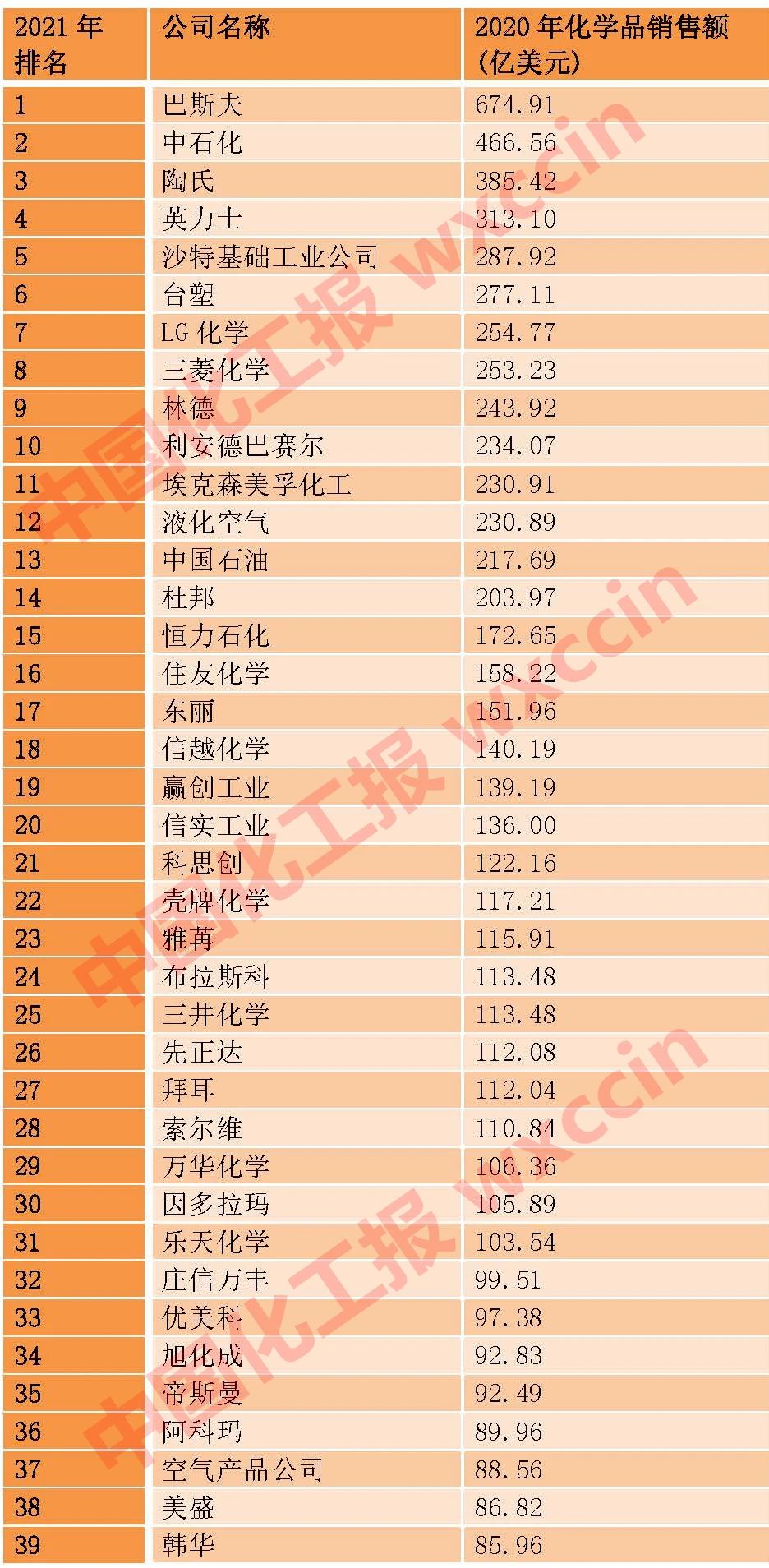 巴斯夫位居第一,2020年化學(xué)品銷售額為674.9億美元,相比2019年略降0.3%;中石化的化學(xué)品銷售額為466.6億美元,與巴斯夫的差距大幅拉大,落后近210億美元;陶氏銷售額為385.4億美元,下降10.3%。