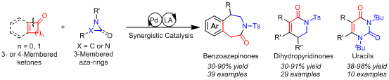 具體而言,研究人員巧妙使用鈀/路易斯酸協(xié)同催化概念,將環(huán)酮化合物(三元和四元環(huán))與氮雜三元環(huán)分別進(jìn)行活化,利用反應(yīng)中形成的氮雜有機(jī)金屬物種上的氮負(fù)離子對羰基的加成作為連接反應(yīng),結(jié)構(gòu)其他金屬催化基元步驟,成功實(shí)現(xiàn)兩個小環(huán)的融合、擴(kuò)環(huán),獲得多種多樣的吖庚因、吡啶酮和尿嘧啶骨架(圖1)。該類反應(yīng)具有靈活性好、效率高并且是立體專一性的反應(yīng)。論文中,研究人員證明采用這一新的含氮雜環(huán)合成策略能夠大大簡化許多天然產(chǎn)物以及重要藥物分子的合成,縮短反應(yīng)步驟、提高合成效率。