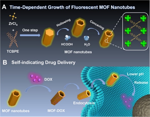 中國科學院成都生物研究所天然產(chǎn)物研究中心邵華武研究員課題組與南方科技大學蔣興宇教授課題組合作通過對MOFs前驅(qū)參數(shù)的調(diào)控,已成功制備出具有強熒光性能的空心MOF納米管,且可用于自我指示的藥物遞送。在一步合成過程中,通過監(jiān)控反應的進行,發(fā)現(xiàn)該空心的六邊形納米管經(jīng)歷了自模板的生長以及隨后的凹陷進化過程,這揭示了空心結(jié)構(gòu)的形成是動力學的而不是熱力學的,該MOF的合成可以用逐步溶出-再生長機理去解釋。