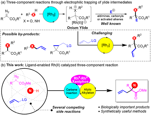 國科學(xué)院上海有機(jī)化學(xué)研究所金屬有機(jī)化學(xué)國家重點(diǎn)實(shí)驗(yàn)室王曉明課題組致力于研究雙(多)金屬物種參與的反應(yīng)體系,包括通過金屬間電子傳遞、基團(tuán)轉(zhuǎn)移實(shí)現(xiàn)挑戰(zhàn)性的轉(zhuǎn)化過程和探究內(nèi)在規(guī)律、仿酶的雙(多)核金屬催化劑的開發(fā)和金屬團(tuán)簇催化反應(yīng)等。由于Rh2(Oct)4特殊的包含金屬-金屬鍵的雙核結(jié)構(gòu),通過配體與一個金屬Rh中心的配位有望改變另外一個Rh中心的催化反應(yīng)性質(zhì)。近日,王曉明團(tuán)隊(duì)與南開大學(xué)彭謙團(tuán)隊(duì)合作,采用Rh2(Oct)4/Xantphos的新穎組合實(shí)現(xiàn)了胺、重氮化合物與烯丙基化合物的三組份反應(yīng)(J. Am. Chem. Soc. 2021, doi.org/10.1021/jacs.1c05701)。在雙膦配體Xantphos的修飾下,雙核Rh(II)表現(xiàn)出催化烯丙基烷基化反應(yīng)的活性,是該三組份反應(yīng)成功的關(guān)鍵之一。該方法操作簡單、條件溫和,以中等至良好的收率合成了一系列a-季碳a-氨基酸衍生物,并且可以適用于一些相對復(fù)雜的底物分子,反應(yīng)產(chǎn)物可被進(jìn)一步應(yīng)用于后續(xù)的合成轉(zhuǎn)化中。