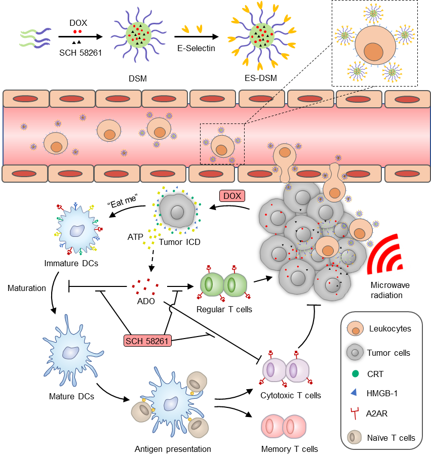 杜永忠教授致力于新型納米給藥系統(tǒng)的開發(fā)及腫瘤靶向免疫治療研究,課題組近年來在Angewandte Chemie International Edition、Nano Letters、Biomaterials、 Journal of Controlled Release、ACS Applied Materials & Interface等國際著名期刊發(fā)表多項(xiàng)原創(chuàng)性工作。本研究在前期工作的基礎(chǔ)上,針對(duì)上述矛盾,設(shè)計(jì)了一種共載ICD誘導(dǎo)劑阿霉素和A2AR拮抗劑SCH 58261的溫敏性膠束,并在表面修飾E-選擇素,靜脈注射后可在E-選擇素的介導(dǎo)下粘附在白細(xì)胞的表面,隨白細(xì)胞一同遷移至腫瘤部位,實(shí)現(xiàn)納米粒的腫瘤高度富集,還解決了人工合成納米粒易被網(wǎng)狀內(nèi)皮系統(tǒng)捕獲、難以穿透生物屏障等問題。