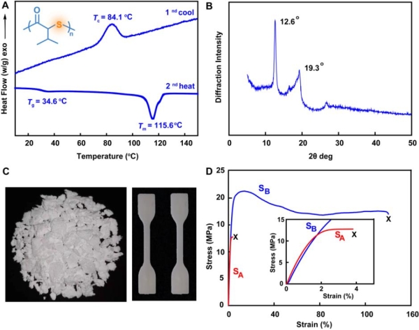 來(lái)源于纈氨酸的異丙基硫交酯的聚合產(chǎn)物具有無(wú)規(guī)但是結(jié)晶的不同尋常的特性,熔點(diǎn)為115oC,可以注塑成啞鈴型樣條,拉伸強(qiáng)度可達(dá)21Mpa(圖2)??傊蚪货误w的原料來(lái)源廣泛、容易合成、動(dòng)力學(xué)聚合活性高、容易實(shí)現(xiàn)閉環(huán)回收、聚合產(chǎn)物具有無(wú)規(guī)但是結(jié)晶的不同尋常的特性,未來(lái)有希望實(shí)現(xiàn)規(guī)?;苽浜蛻?yīng)用。