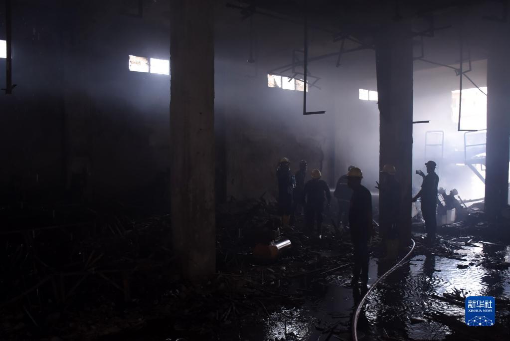 8月27日,消防員在巴基斯坦卡拉奇的火災現(xiàn)場工作。新華社發(fā)