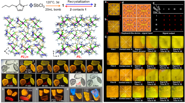 伴隨著熒光顏色變化的分子識(shí)別因其在傳感器、成像、信息存儲(chǔ)和防偽等領(lǐng)域的潛在應(yīng)用而受到越來(lái)越多的關(guān)注。然而,這類(lèi)識(shí)別通常發(fā)生在固/氣界面或液體環(huán)境中,而固體與固體之間的識(shí)別現(xiàn)象迄今仍未有報(bào)道。近日,中國(guó)科學(xué)院福建物質(zhì)結(jié)構(gòu)研究所結(jié)構(gòu)化學(xué)國(guó)家重點(diǎn)實(shí)驗(yàn)室黃小滎研究員領(lǐng)導(dǎo)的課題組,在前期研究的基礎(chǔ)上利用含有丁基鏈的咪唑基離子液體[Bmmim]Cl(Bmmim = 1-丁基-2, 3-二甲基咪唑鎓陽(yáng)離子)具有多穩(wěn)態(tài)構(gòu)象的特性,設(shè)計(jì)了一種具有多穩(wěn)態(tài)結(jié)構(gòu)的零維金屬鹵化物發(fā)光材料。通過(guò)改變合成方法(離子熱和重結(jié)晶),他們制備了黃光發(fā)射的α-[Bmmim]2SbCl5 (1) 和橙光發(fā)射的β-[Bmmim]2SbCl5 (2) 兩例銻鹵化物異構(gòu)體,對(duì)它們的光物理性能進(jìn)行了系統(tǒng)研究。有趣的是,兩個(gè)異構(gòu)體的單晶在相互接觸條件下可以發(fā)生特異性識(shí)別現(xiàn)象,實(shí)現(xiàn)類(lèi)似于多米諾效應(yīng)的單晶到單晶的相變?;趯?duì)實(shí)驗(yàn)現(xiàn)象的觀察和表征技術(shù),他們首次提出了晶相識(shí)別(crystalline phase recognition)這一分子識(shí)別領(lǐng)域的新機(jī)制,并進(jìn)一步研究了這一新型發(fā)光轉(zhuǎn)變模式在時(shí)間分辨的信息加密領(lǐng)域的潛在應(yīng)用。