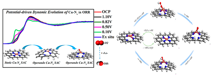 近日,中國(guó)科學(xué)院大連化學(xué)物理研究所催化與新材料研究室(十五室)張濤院士、王愛琴研究員、楊小峰研究員等與廈門大學(xué)田中群院士、李劍鋒教授等合作,在氮碳載體上設(shè)計(jì)并構(gòu)筑了均勻分散的銅單原子催化劑(Cu-N-C SAC),將其應(yīng)用于堿性電催化氧還原反應(yīng)中,并通過原位X射線吸收光譜技術(shù)(operando-XAS)揭示其在反應(yīng)過程中的可逆動(dòng)態(tài)演變。