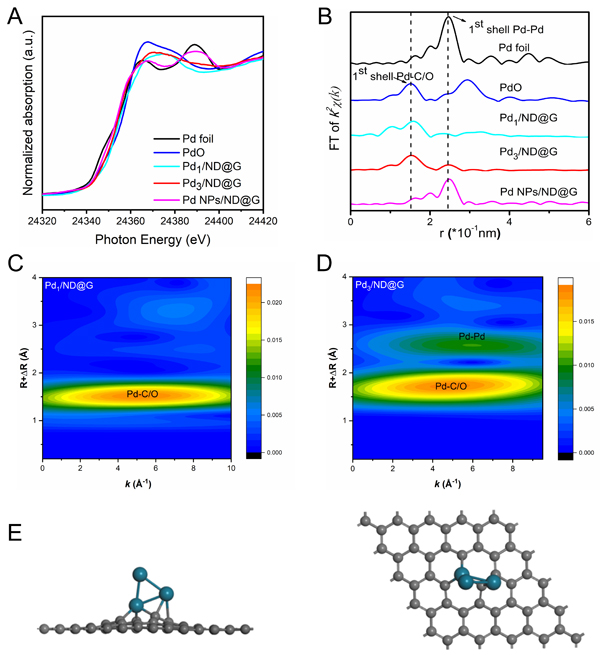 圖1. (A) X射線吸收近邊結(jié)構(gòu)譜圖;(B) 傅里葉變換后R空間徑向結(jié)構(gòu)函數(shù);(C, D) Pd1/ND@G和Pd3/ND@G的EXAFS振蕩小波變換;(E) Pd3 金屬團簇的最優(yōu)結(jié)構(gòu)模型圖(左:側(cè)視圖,右:俯視圖)。