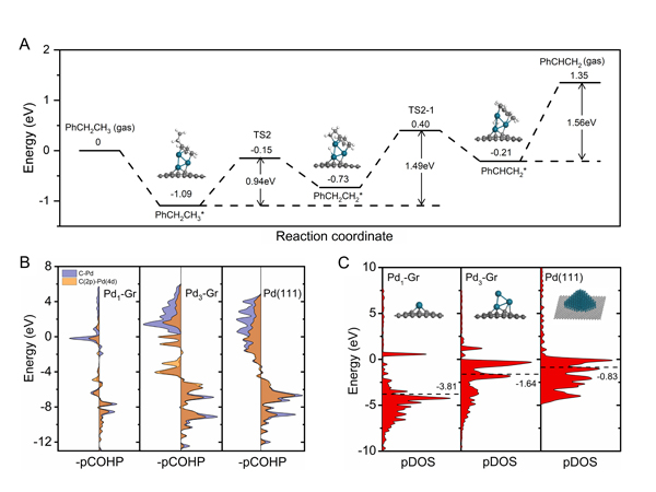 圖3. Pd催化劑上乙苯直接脫氫反應(yīng)能量變化曲線及投影晶體軌道哈密頓布居(pCOHP)和投影態(tài)密度(pDOS)結(jié)果分析。